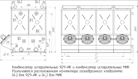 Испарительные конденсаторы типа МИК предназначены для работы в составе промышленных аммиачных холодильных установок. В течение последних лет испарительные конденсаторы были существенно изменены. Конструкция теплообменного пучка теперь представляет собой многотрубный змеевик с наклонными трубами и современной плотной компоновкой теплообменного пучка. Конструкция теплообменного пучка позволяет произвести равномерную раздачу по шлангам паров хладагента без подтопления нижнего ряда труб пучка жидким аммиаком. Кроме того, изменены, в лучшую сторону, аэродинамические характеристики аппаратов: